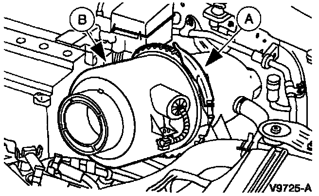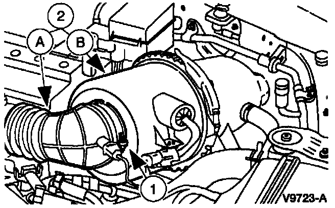 2 Separate the (A) air cleaner outlet tube from the (B) engine air cleaner.