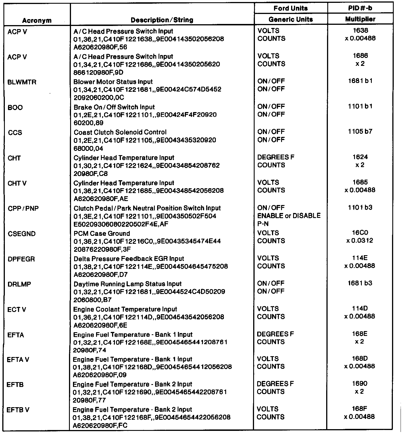 The Ford Parameter Identification (PID) list reflects only Ford manufacturer-specific PIDs used in the diagnostic procedures. The table lists the string of characters entered in a generic scan tool when accessing enhanced diagnostic PID information. When accessing these PIDs, the values will be continuously updated. For more information, refer to the Society of Automotive Engineers (SAE) J2205 document. Multiply the number of counts by the multiplier provided in the table for the proper conversion to Ford units.NOTE: Be sure the PID is supported by the vehicle strategy according to the pinpoint test step or the strings may display erroneous data.