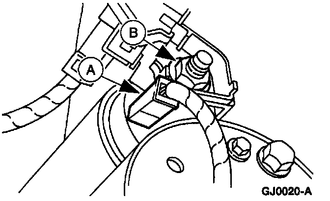 5. Disconnect the (A) S-terminal wire, and the (B) B-terminal nut and cable from the starter solenoid.