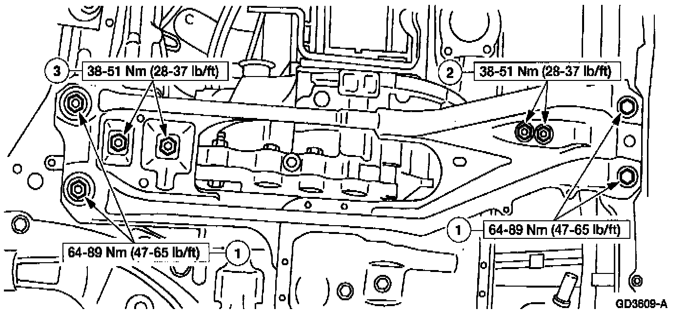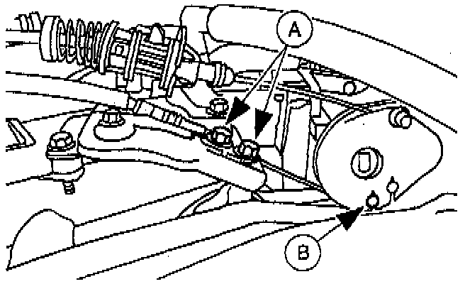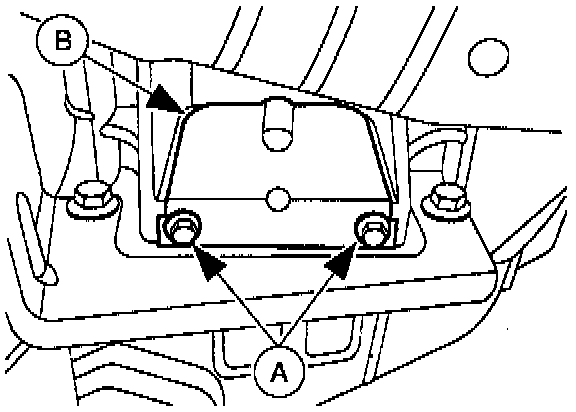 8. Install the (A) front engine crossmember bolts and the (B) front engine crossmember.