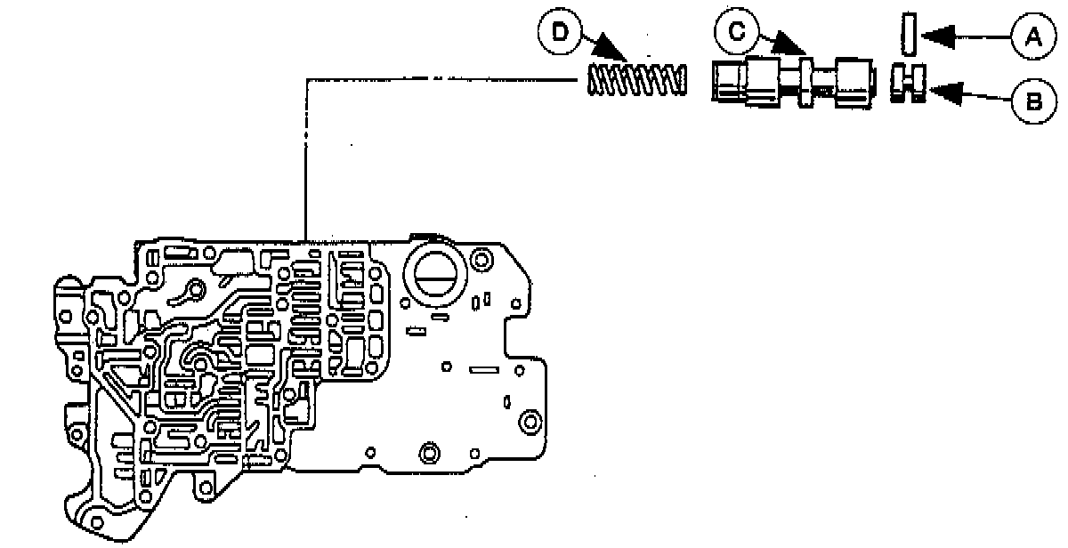 NOTE: Each valve should slide in and out of its bore under its own weight. When a valve will not slide out under its own weight, depending on the valve, push it out with a wire or place the valve body open-side down and lightly tap it with a soft hammer. Never scratch or damage a valve bore. Do not drop the valves or use a valve that has been damaged. Before assembling the valve body, be certain that all valves are clean and lubricated with automatic transaxle fluid.1. Remove the (A) stop pin, (B) stop plug, (C) bypass valve, and the (D) bypass valve spring.