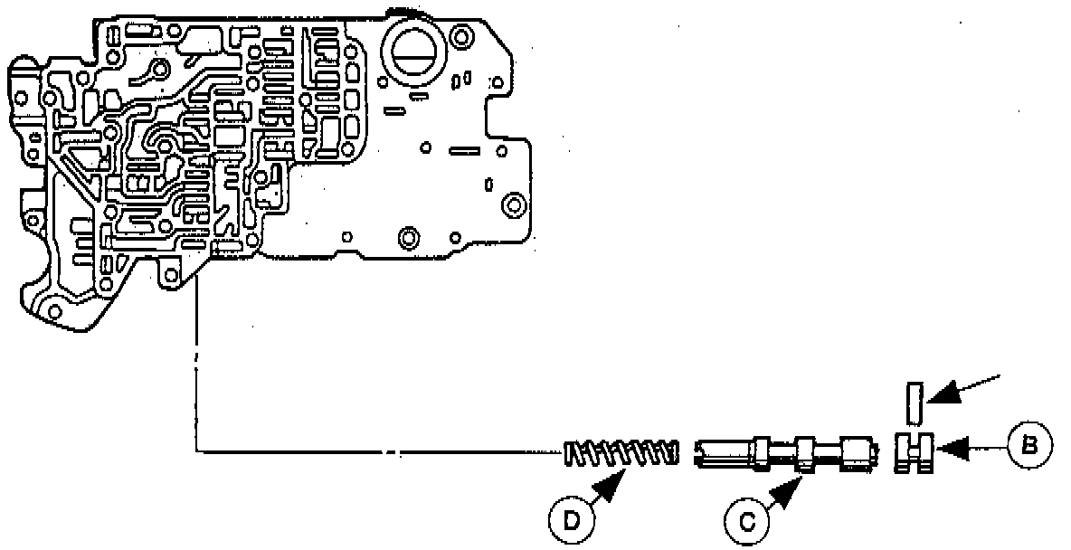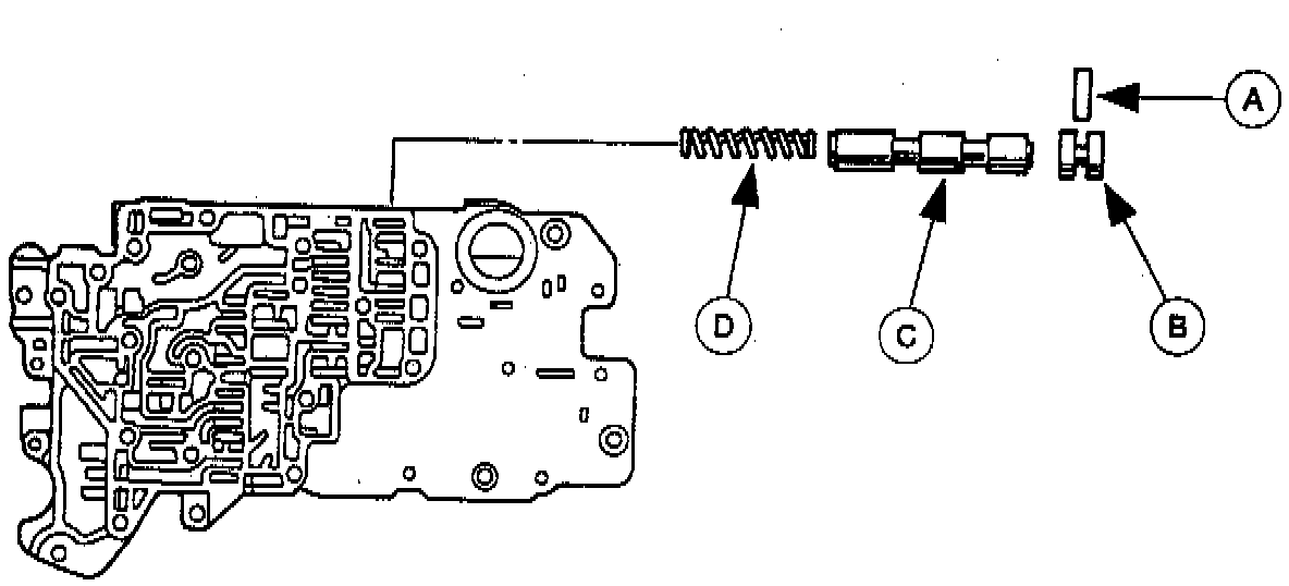 2. Remove the (A) stop pin, (B) stop plug, (C) 2-3 shift valve, and the (D) 2-3 shift valve spring.