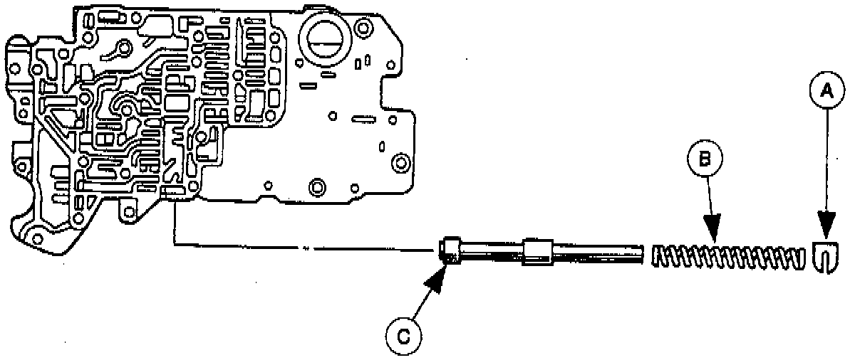 3. Remove the (A) retainer, (B) converter relief valve spring, and the (C) converter relief valve.