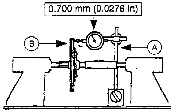 9. Use (A) Dial Indicator Magnetic Base D78P-4201-B and inspect the (B) clutch disc run out. Replace the clutch disc if not within specifications.