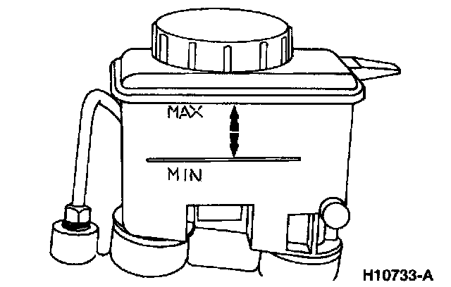 1. Check the brake fluid level. If the fluid level is below the MIN line on the brake master cylinder reservoir add the required amount of High Performance DOT 3 Brake Fluid C6AZ-19542-AB meeting Ford specification ESA-M6C25-A or DOT 3 equivalent.
