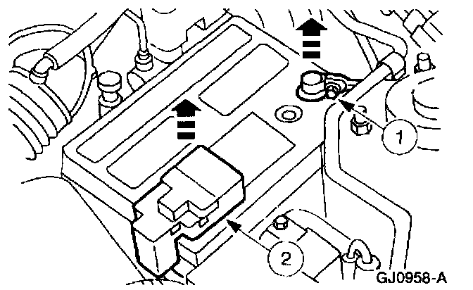 REMOVALWARNING: BATTERIES NORMALLY PRODUCE EXPLOSIVE GASES WHICH CAN CAUSE PERSONAL INJURY. THEREFORE, DO NOT ALLOW FLAMES, SPARKS OR LIGHTED SUBSTANCES TO COME NEAR THE BATTERY. WHEN CHARGING OR WORKING NEAR A BATTERY, ALWAYS SHIELD YOUR FACE AND PROTECT YOUR EYES. ALWAYS PROVIDE VENTILATION. WHEN LIFTING A PLASTIC-CASED BATTERY, EXCESSIVE PRESSURE ON THE END WALLS COULD CAUSE ACID TO SPEW THROUGH THE VENT CAPS, RESULTING IN PERSONAL INJURY. LIFT WITH A BATTERY CARRIER OR WITH YOUR HANDS ON OPPOSITE CORNERS.