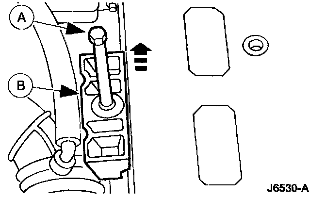 3. Remove the (A) battery hold down bolt and the (B) battery hold down clamp.