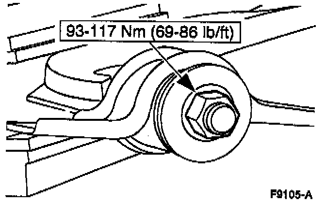 2. Remove the nut and the front suspension lower arm mounting bolt bushing (rear) and washer.