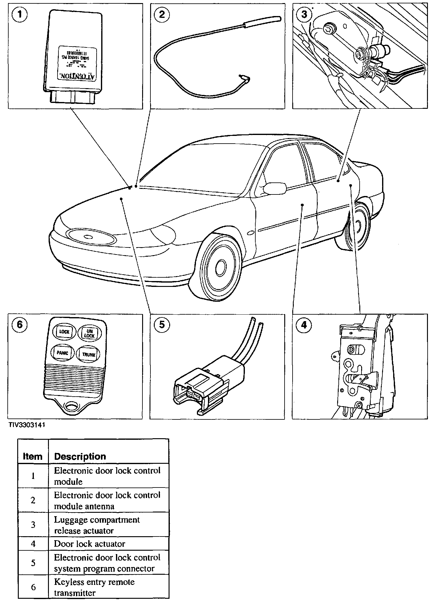 The electronic door lock control module contains a radio receiver that receives a signal from the keyless entry remote transmitter through the electronic door lock control module antenna. When a signal is received, the electronic door lock control module sends the appropriate command to the door lock actuators, the horn relay, the luggage compartment release actuator, central timer module, and the exterior lights.