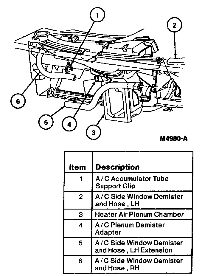 2. Disconnect RH A/C side window demister and hose and LH A/C side window demister and hose from A/C plenum demister adapter on heater air plenum chamber.