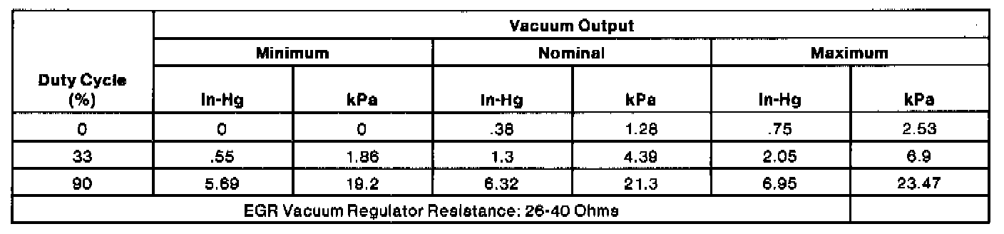 3. The EGR vacuum regulator solenoid receives a variable duty cycle signal (0 to 100%). The higher the duty cycle the more vacuum the solenoid diverts to the EGR valve.