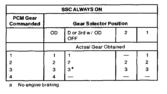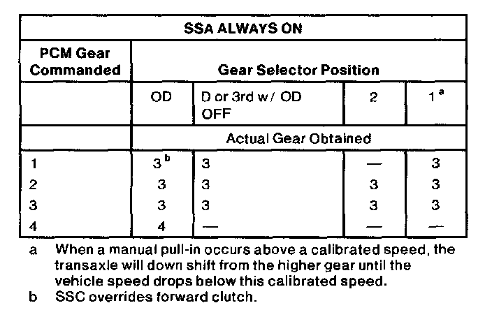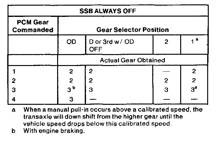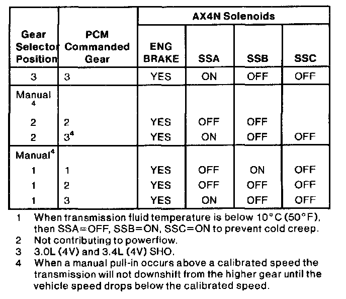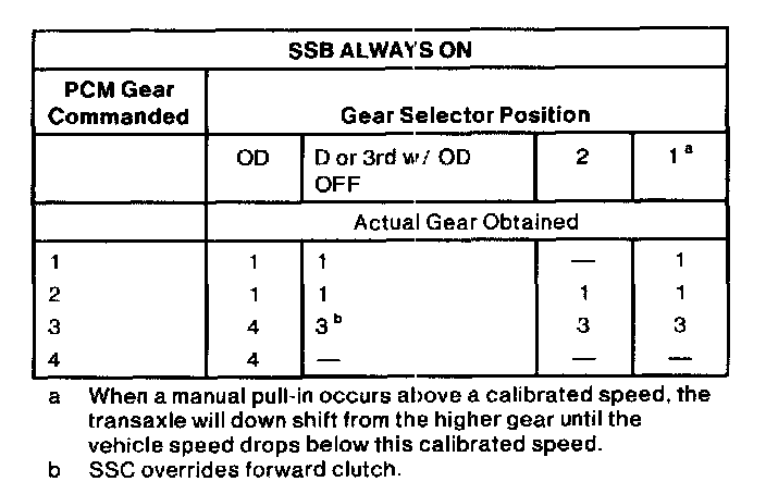 1. When transmission fluid temperature is below 10°C (5-°F), then SSA=OFF, SSB=ON to prevent cold creep.