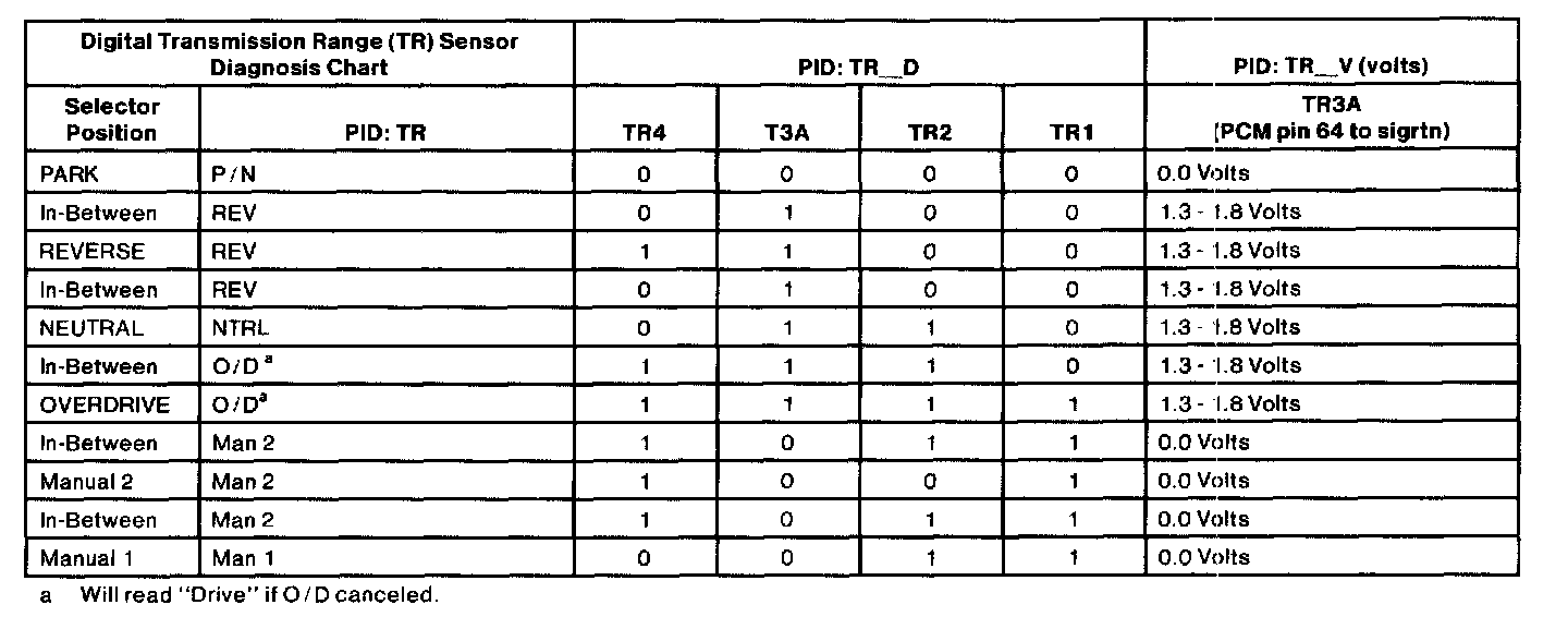 - 1.8-5.0 volts = Invalid Reading (open in wires or bad resistor in digital TR sensor).