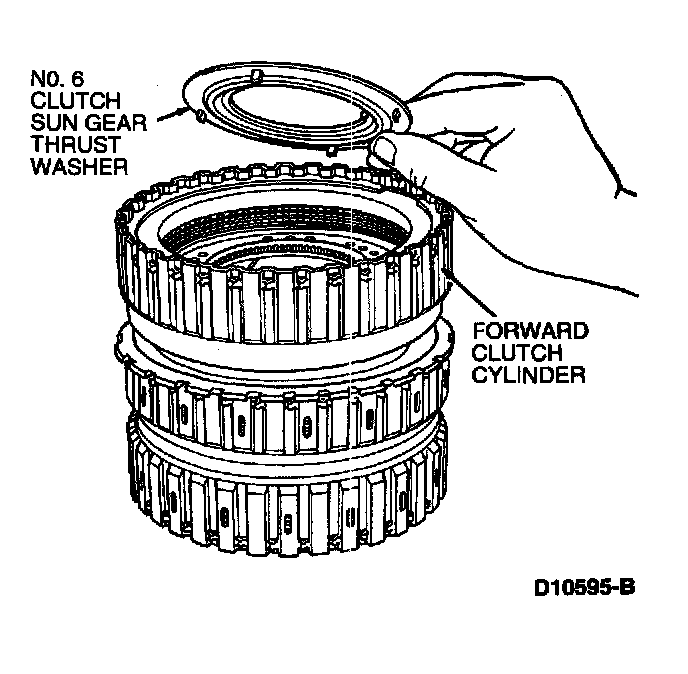 1. Place direct/intermediate clutch cylinder with intermediate clutch facing down.2. Install No. 7 thrust washer into direct clutch being sure tabs are aligned with slots in direct clutch.