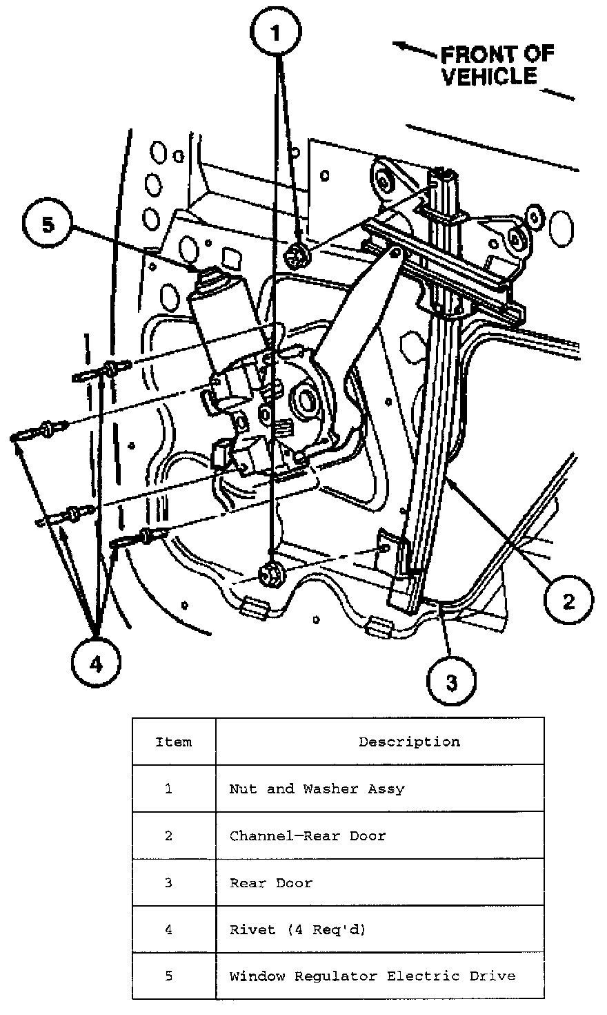 3. Remove four rivets attaching regulator mounting plate assembly to rear door inner panel.