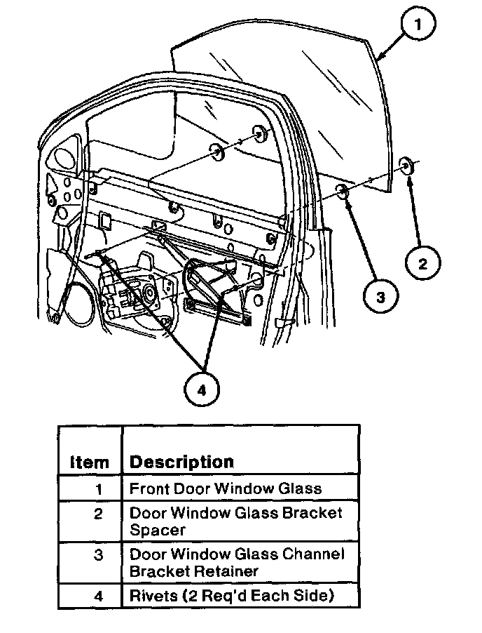 4. Lower front door window glass to access holes in front door inner panel. Remove two rivets retaining front door window glass to front door window channel bracket.