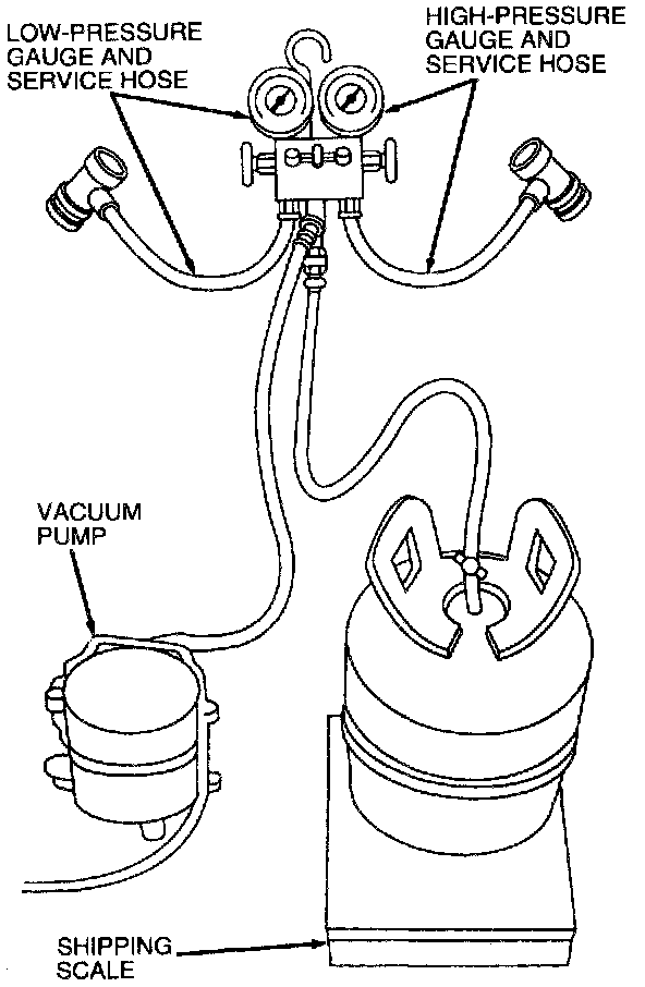 2. When evacuating the system with the vacuum pump, the gauge set second center hose should be connected to the charging cylinder and opened to the gauge set so that the hose will be evacuated with the system.