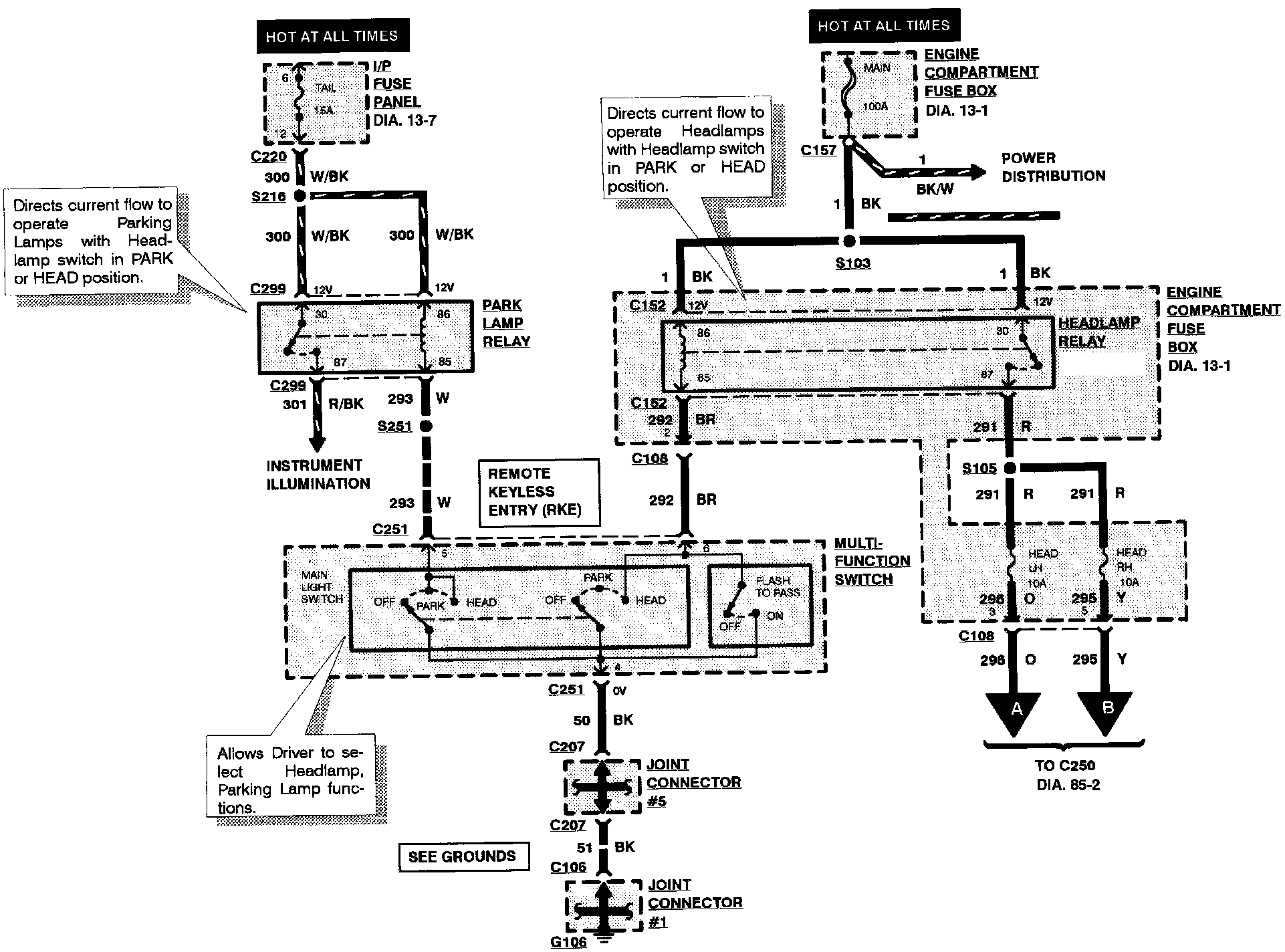 Components that work together are shown together in a system/subsystem diagram or set of diagrams. The system feed (circuit breaker, fuse, etc.) is shown at the top of a diagram page. All wires, connectors, components, and splices are shown in the same manner that the current flows, ending at the ground at the bottom of a diagram page. Circuits that go from one diagram page to another will be marked with large arrow heads indicating which diagram page the circuit went to/came from.