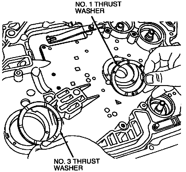 11. Install No. 1 drive sprocket thrust washer and No. 3 chain cover thrust washer. Use petroleum jelly to hold them in place.