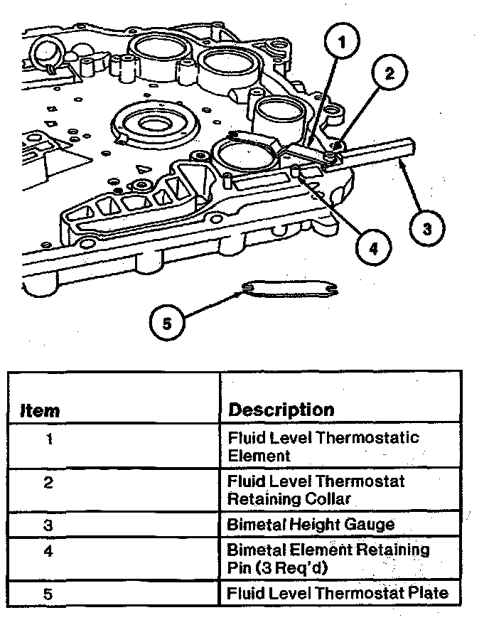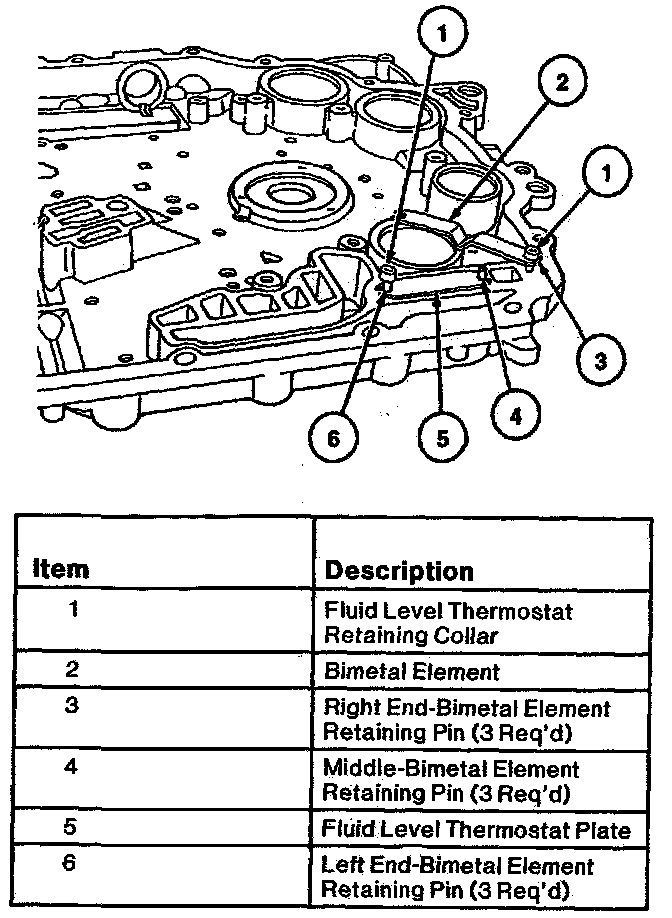 5. Remove slotted end of bimetal element from pin. Position fluid level thermostat plate over end and middle retaining pins.