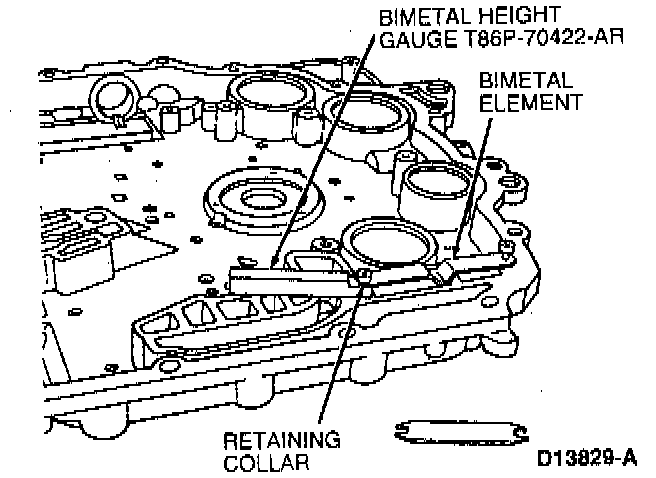 4. Engage slotted end of bimetal element under rear retaining pin. Place Bimetal Height Gauge T86P-70422-AR against retaining pin and under bimetal element. Gently tap retaining collar onto pin until it seats against tool.