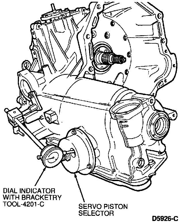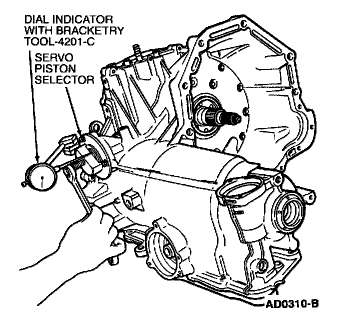 67. Mount Dial Indicator with Bracketry 100-002 (TOOL-4201 -C) or equivalent and position stylus through hole in Overdrive Servo Rod Tool. Make certain indicator stylus has contacted overdrive servo piston on a flat surface. DO NOT contact step on piston. Zero dial indicator.