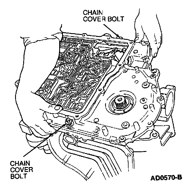 Carefully align chain cover turbine shaft bore with turbine shaft. Apply gentle downward pressure on chain cover to overcome accumulator spring pressure and start two chain cover bolts.