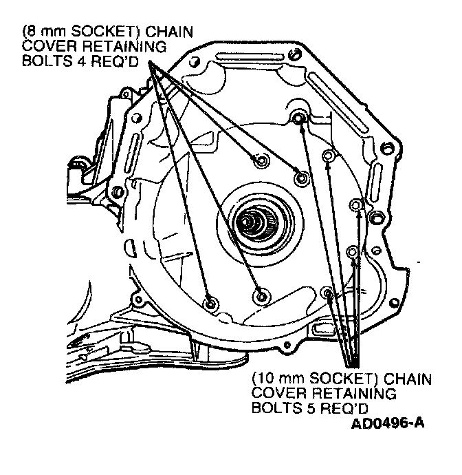 58. Install remaining chain cover bolts in bellhousing. Tighten (10 mm socket) bolts to 25-28 Nm (19-20 ft. lbs.). Tighten (8 mm socket) bolts to 9-12 Nm (80-106 inch lbs.).