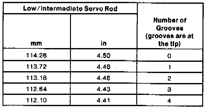Back off center screw until piston movement stops and read dial indicator. The reading should be 5.5-6.5 mm (0.216-0.255 inch). If measurement does not meet specifications, refer to low/intermediate servo rod selection chart to determine which rod to install.