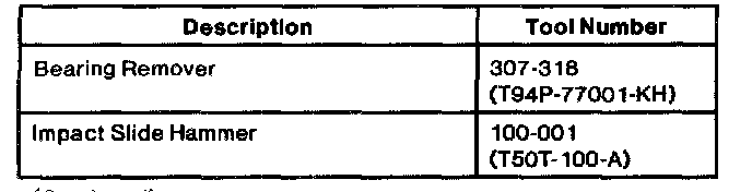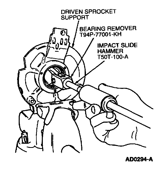 3. Inspect and replace driven sprocket bearing if necessary using Bearing Remover 307-318 (T94P-77001-KH) and Impact Slide Hammer 100-001 (T50T-100-A).