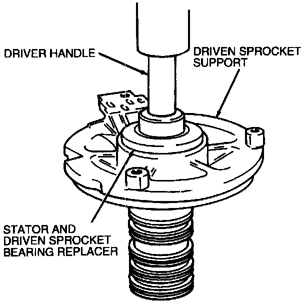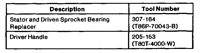 1. If removed, press driven sprocket bearing using an arbor press, Stator and Driven Sprocket Bearing Replacer 307-164 (T86P-70043-B), and Driver Handle 205-153 (T80T-4000-W).