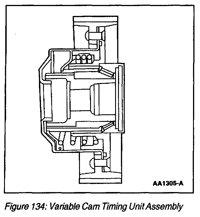 The variable cam timing unit assembly is coupled to the camshaft through a helical spline in the VCT unit chamber. When the flow of oil is shifted from one side of the chamber to the other, the differential change in oil pressure forces the piston to move linearly along the axis of the camshaft. This linear motion is translated into rotational camshaft motion through the helical spline coupling. A spring installed in the chamber is designed to hold the camshaft in the minimum overlap position (5 degrees) when oil pressure is too low to maintain adequate position control. The camshaft is allowed to rotate up to 30 degrees.