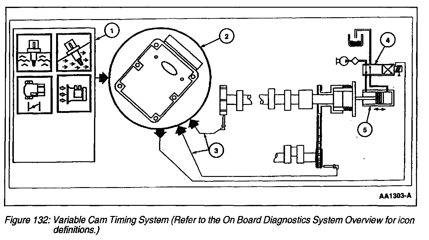 The Variable Cam Timing (VCT) System consists of the control solenoid, five-tooth pulse ring (4+1) on exhaust camshaft, Intake Air Temperature (IAT) sensor, Engine Coolant Temperature (ECT) sensor, Camshaft Position (CMP) sensor, Mass Air Flow (MAF) sensor, Crankshaft Position (CKP) sensor, Powertrain Control Module (PCM).