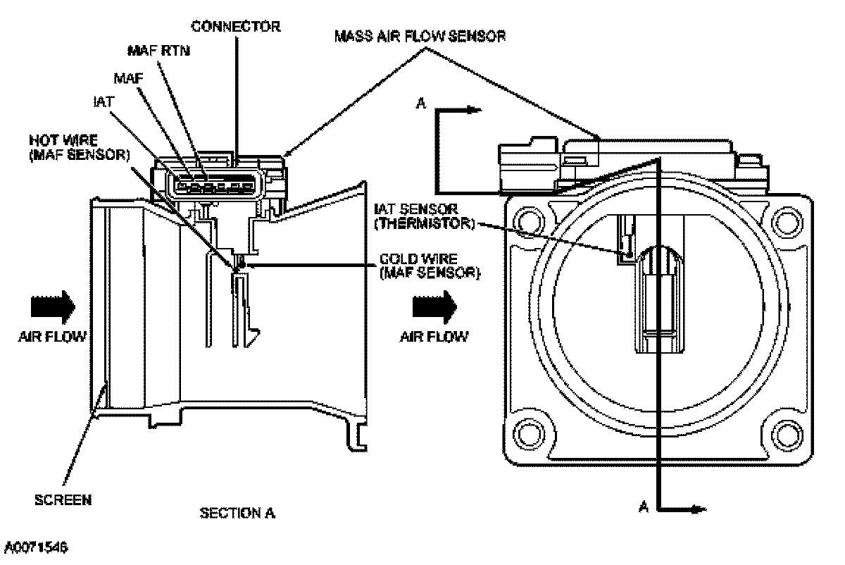 Figure 36: Diagram Of Air Flow Through Throttle Body Contacting MAF Sensor Hot And Cold Wire (and IAT Sensor Wire Where Applicable) Terminals.: