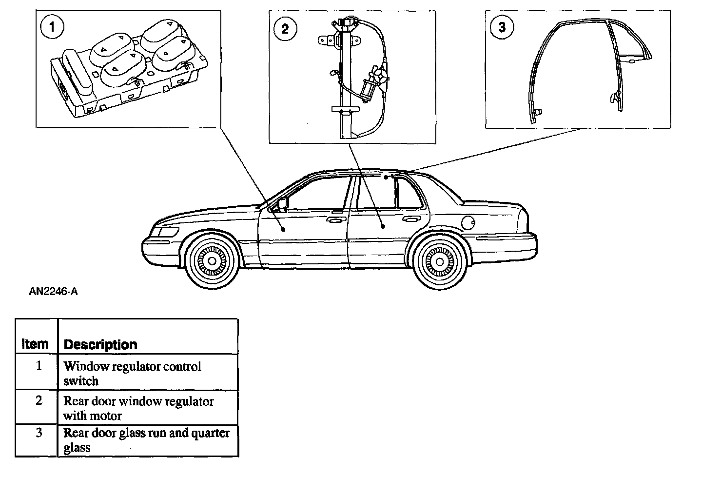 ^ The rear door glass run contains the quarter glass and is removed as an assembly.