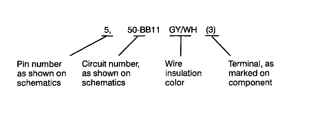 Testing information for each component includes a schematic with component terminal locations and step-by step test procedures. Component terminals are identified by: