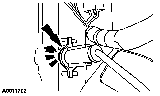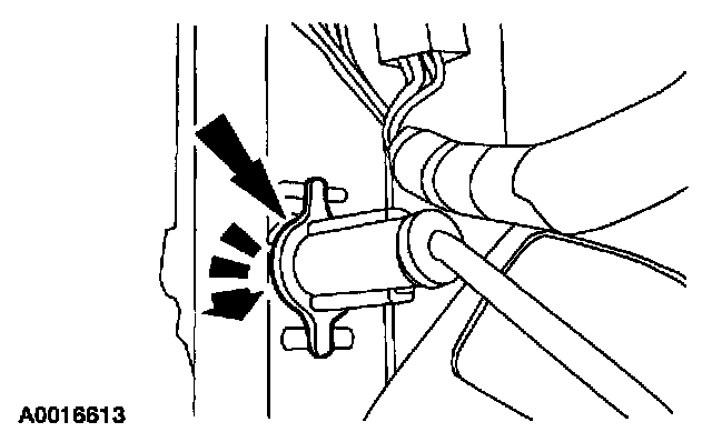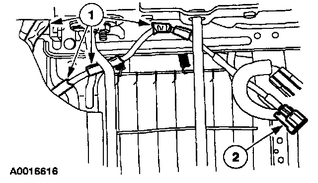 NOTE: If the pin-type retainers are damaged, install new retainers. This will keep the wiring harness routed correctly.