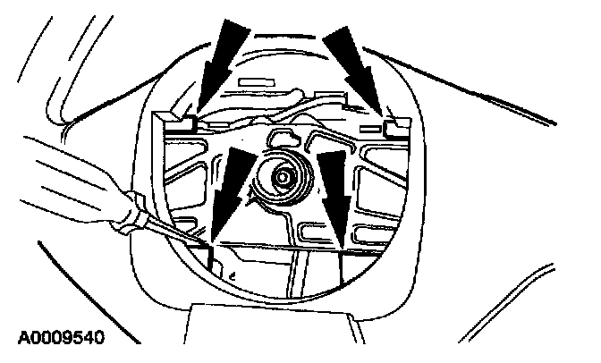 8. Carefully pry up between the air bag module backing plate and the steering wheel and remove the driver air bag module.