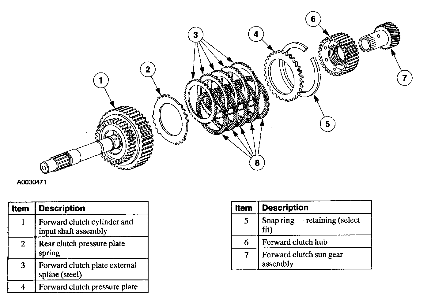 The forward clutch couples the forward clutch cylinder and input shaft to the forward sun gear in first, second, and third gears. The forward clutch is not applied in fourth gear.