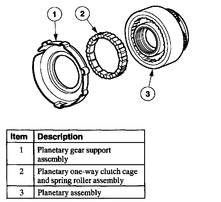 The planetary (low) one-way clutch is a roller clutch that holds the planetary gearset in first gear, (D) and D ranges. During automatic coasting downshifts into first gear (D) and D ranges), the planetary one-way clutch freewheels so there is no engine braking.