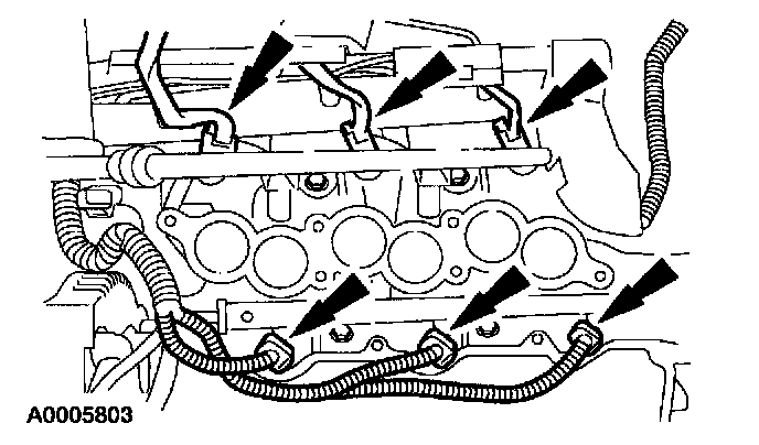 4. Disconnect the engine control sensor wiring harness from the fuel injectors.