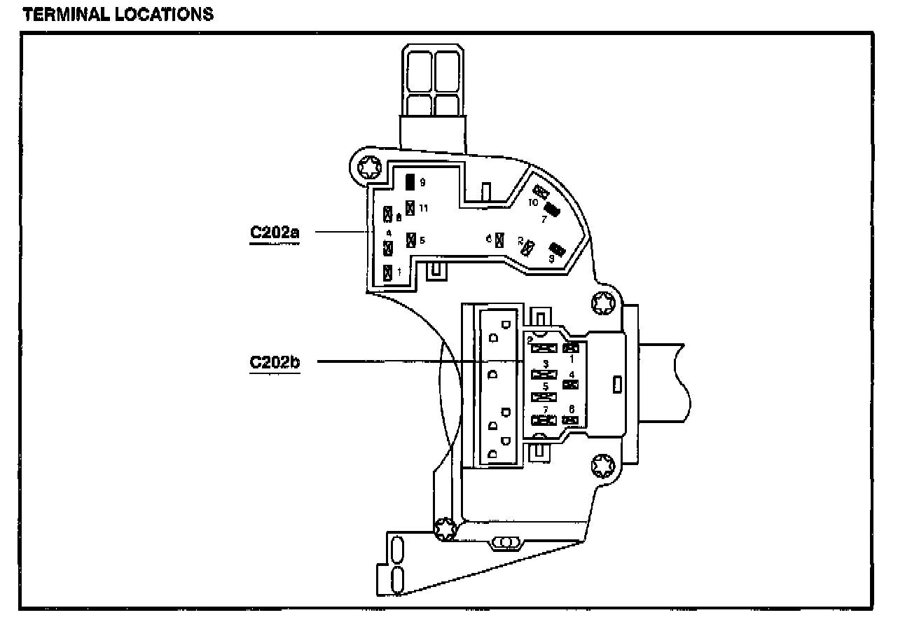 Testing information for each component includes a schematic with component terminal locations and step-by-step test procedures. Component terminals are identified by letters or numbers that may be marked on the component or callout if there is no mark on the component.