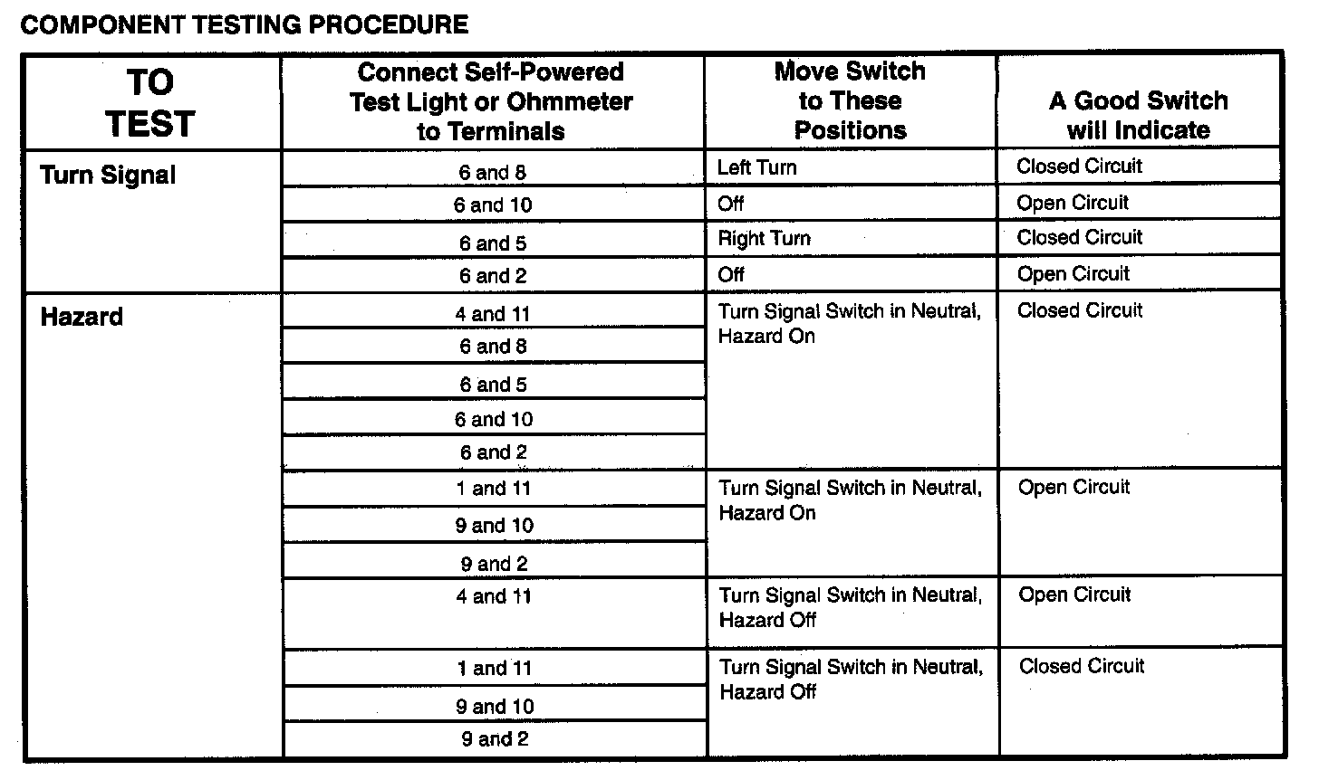 The component connector MUST BE REMOVED before testing. To test a single circuit within the component, select that circuit under the column TO TEST. If you wish to test the complete component, perform all tests.