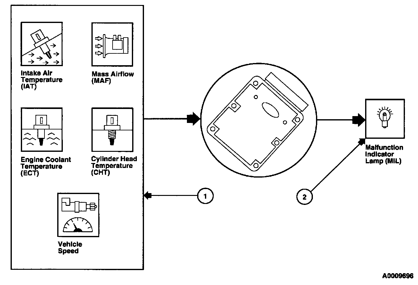 1. Inputs: Engine Coolant Temperature (ECT) or Cylinder Head Temperature (CHT), Intake Air Temperature (IAT), engine LOAD (from Mass Air Flow (MAF) sensor) and vehicle speed input.