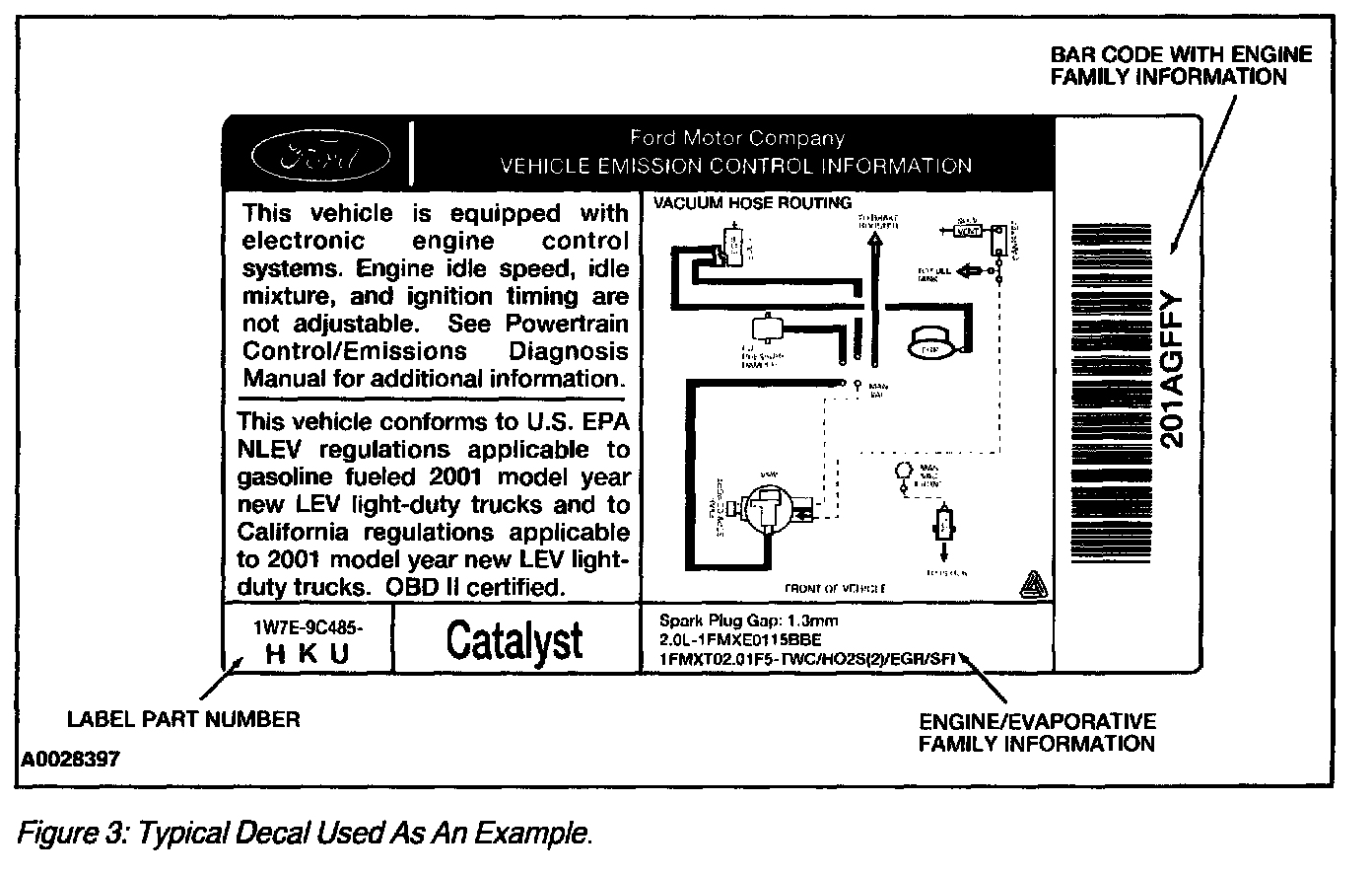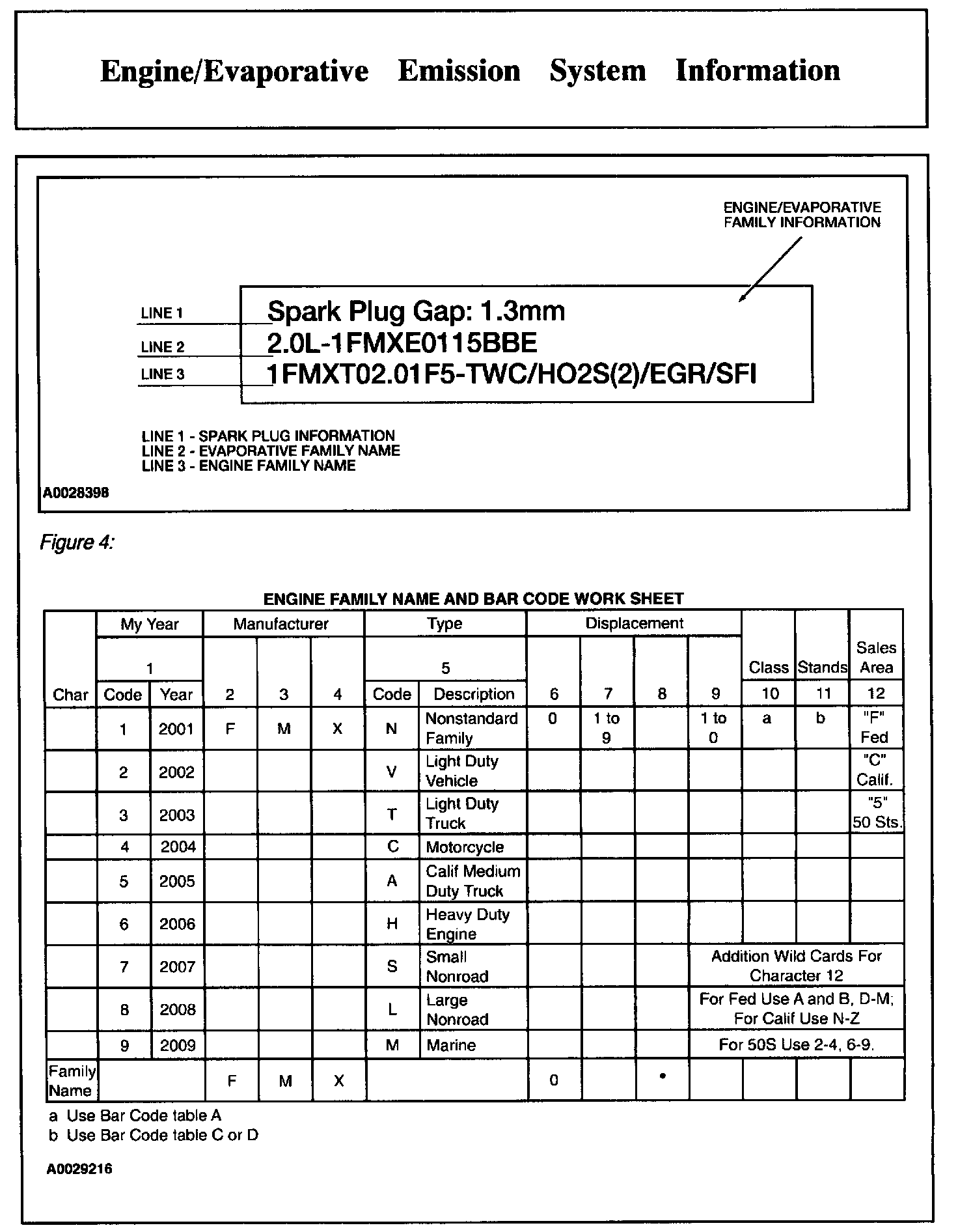 Both the engine family name and the evaporative family names are listed in the box on the emission decal as indicated in Figure 3 and 4, in the area marked as engine/evaporative family information. The first line is the spark plug information. The second line contains the engine size and the evaporative family name (12 characters). The third line contains the engine family name (12 characters) and other vehicle specific information.