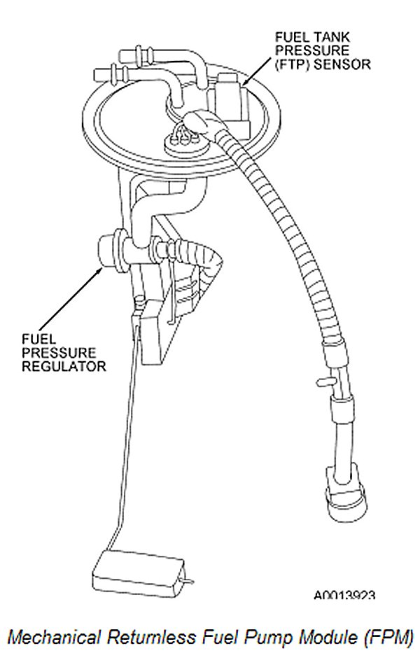 The Fuel Pump (FP) module is a device that contains the fuel pump, fuel pressure regulator and fuel sender assembly. The fuel pump is located inside the FP module reservoir and supplies fuel through the FP module manifold to the engine and FP module jet pump. The jet pump continuously refills the reservoir with fuel, and a check valve located in the manifold outlet maintains system pressure when the fuel pump is not energized. A flapper valve located in the bottom of the reservoir allows fuel to enter the reservoir and prime the fuel pump during the initial fill.
