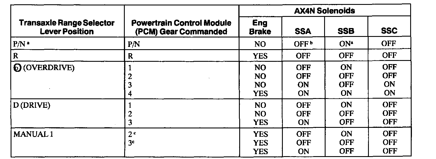 Shift Solenoid Operation Charta When transmission fluid temperature is below 50� then SSA=OFF, SSB=ON, SSC=ON to prevent cold creep.