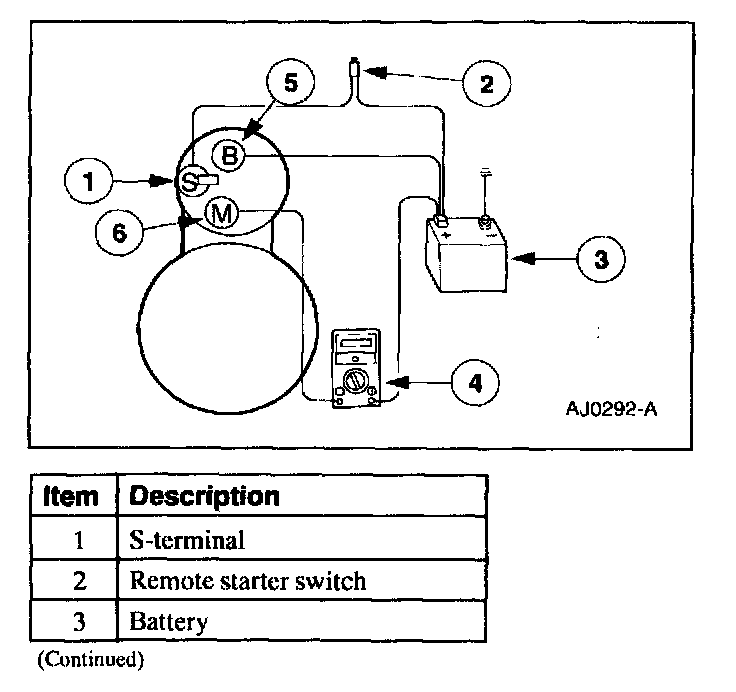 3. Connect a remote starter switch between the starter solenoid S-terminal and the battery positive (+) terminal.