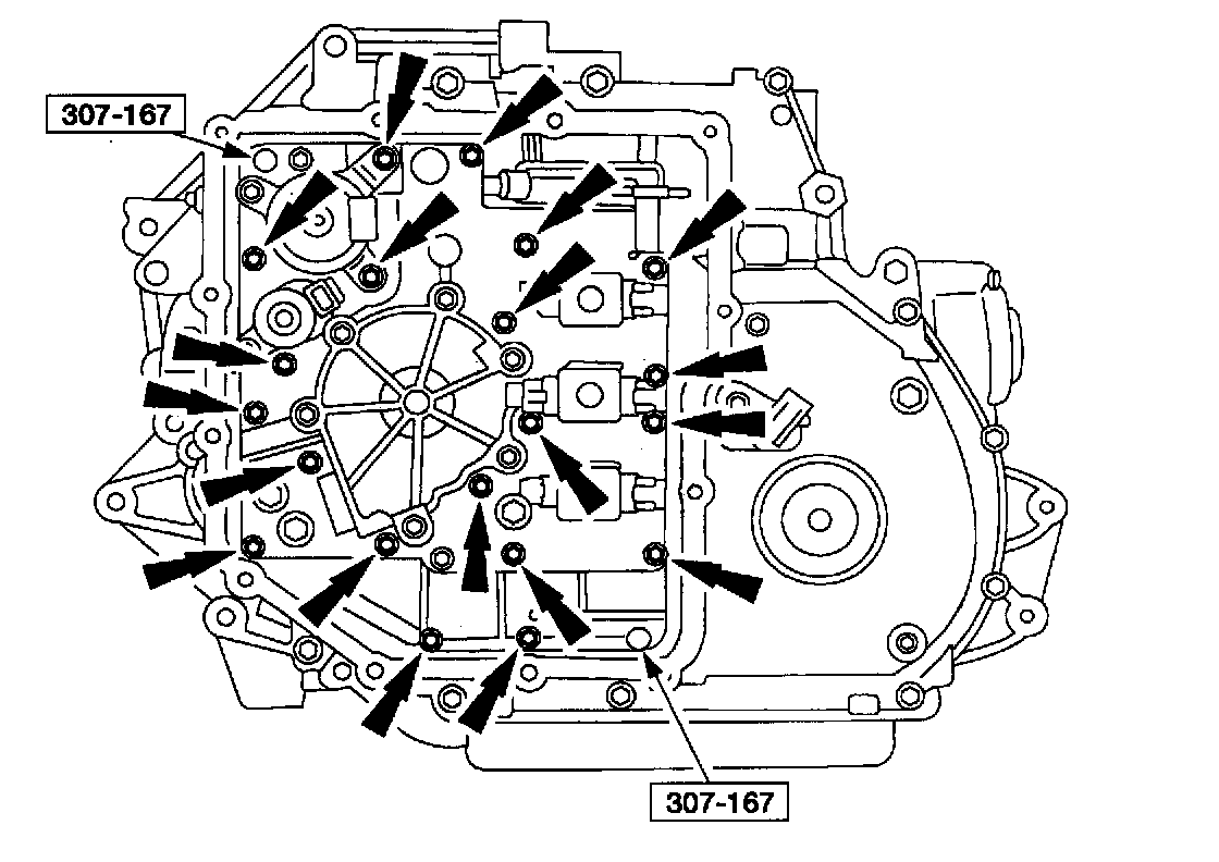 25. CAUTION: Do not remove the two bolts that hold the pump assembly and main control valve body together as the pump assembly may fall from the main control valve body and become damaged.