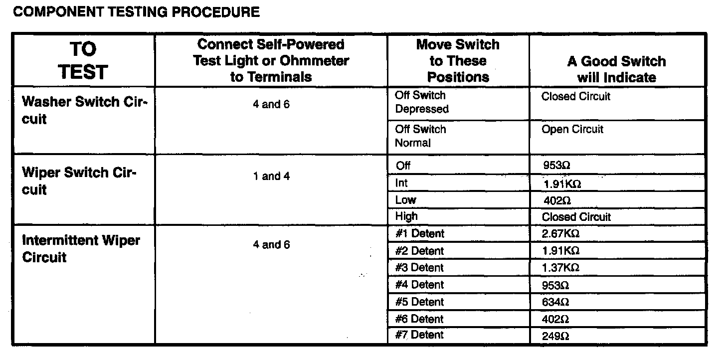 The component connector MUST BE REMOVED before testing. To test a single circuit within the component, select that circuit under the column TO TEST. If you wish to test the complete component, perform all tests.